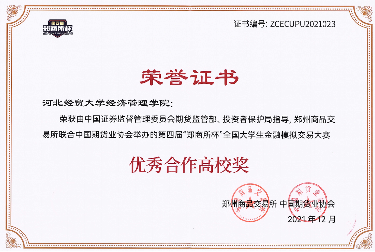 近日,第四届“郑商所杯”全国老员工金融模拟交易大赛落下帷幕并揭晓获奖情况。公司首次参加此项竞赛,实现了期货期权领域专业竞赛的历史性突破,在参赛师生的共同努力下,同浙江大学、南开大学等全国77所高校一同荣获优秀合作高校奖。