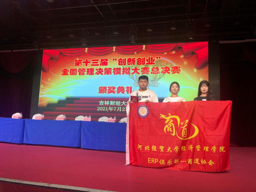 725日至28日,由吉林财经大学承办的第十三届创新创业全国管理决策模拟大赛总决赛在吉林长春举行。公司派出由2019级金融学3班苑佳辉、2019级物流管理1班赵雪莲和2019级电子商务2班关燕微组成的代表队参加了本次比赛。通过三位同学的团结协作,一路过关斩将,脱颖而出,最终取得全国总决赛一等奖的好成绩。