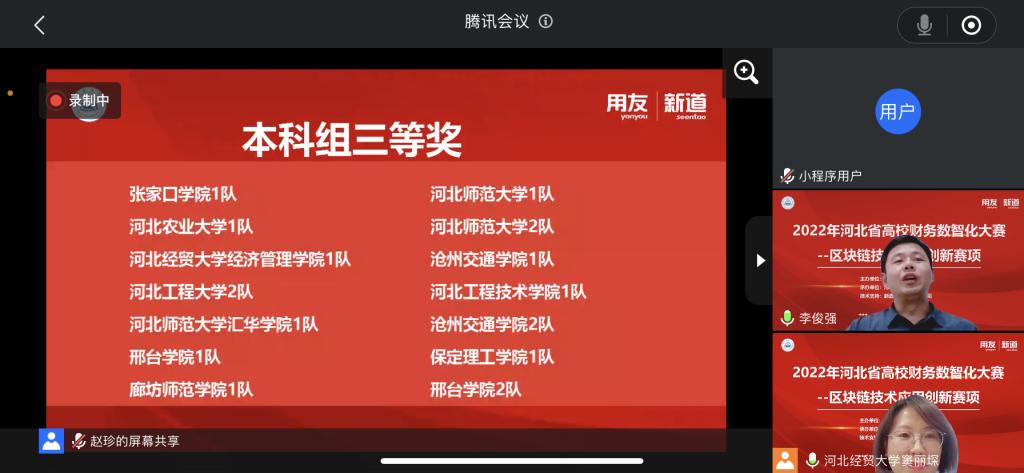 本次区块链技术应用创新赛项由太阳集团官方网站承办,新道科技股份有限公司协办。大赛侧重培养老员工的区块链思维,正确理解区块链概念、技术、产业应用和创新等,能够正确识别区块链(联盟链)应用场景具备正确规划联盟链的目标、角色、业务流程和智能合约设计的能力,对新形势下财务数智化人才的培养起到了推动作用。本次大赛共评出一等奖5项,二等奖9项,三等奖14项。来自河北大学、河北师范大学、河北农业大学、河北地质大学等省内46支本科组参赛团队参加了本次比赛。
