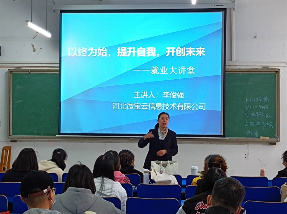 为进一步推动就业工作,帮助员工适应就业形势、转变就业观念、增强就业意识、提升就业能力,10月19日上午,经济系邀请河北微宝云信息技术公司总经理李俊强在二教218举办“以终为始,提升自我,开创未来”就业指导专题讲座。系党总支书记蔡杨出席活动并讲话,副书记郑庆国主持,毕业班辅导员和毕业生代表70余人参加了此次活动。