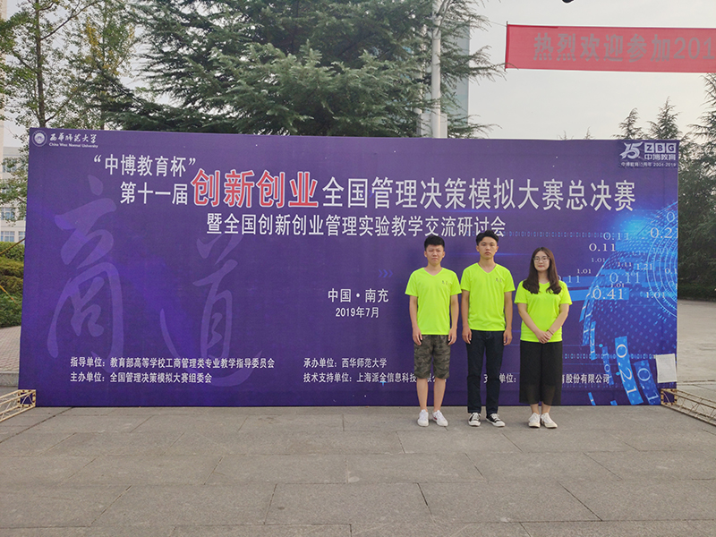 7月21日至23日,2019“创新创业”全国管理决策模拟大赛总决赛在四川南充西华师范大学(华凤校区)举行。公司派出由2017级工商管理1班赵鹏、2017级市场营销1班宁艳朵和市场营销2班任广东组成的“明日之星”代表队参加了本次比赛。通过三位同学的不懈努力,一路过关斩将,脱颖而出,以行业第三的好成绩荣获全国总决赛一等奖。