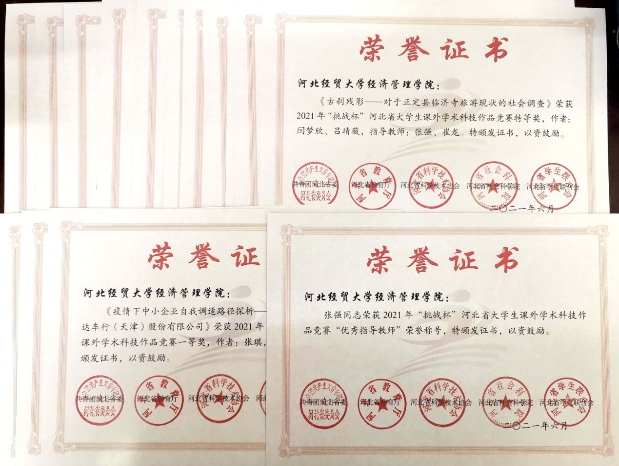 本届大赛自今年二月份启动以来,通过校内层层选拔,经过大赛评审委员会的初评、复评,以及终审答辩,公司报送的作品在全省1642件作品中脱颖而出,共有16项获奖。其中,《古刹残影—对于正定县临济寺旅游现状的社会调查》获得特等奖。《疫情下中小企业自我调适路径探析———阿里巴巴国家站与易路达车行(天津)股份有限公司》等3个项目获得一等奖,《本科生学业“增负”的必要性以及策略研究——以河北省高校为例》获得二等奖,《短视频等自媒体文化的思考》等11个项目获得三等奖。这些奖项的获得充分展示了公司人才培养水平。公司团委全面、高效、系统的组织工作也受到了赛事组委会的充分认可,最终被授予“优秀组织单位奖”。公司教师张强还获得“优秀指导教师”荣誉称号。