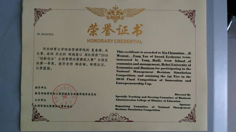 7月19日,2016年“创新创业”全国管理决策模拟大赛总决赛在内蒙古工业大学举行,此次大赛由全国管理决策模拟大赛组委会主办,教育部高等公司工商管理类专业教学指导委员会为指导单位。全国96所大学派代表队参加,公司由2013级财务管理1班夏春棉、财务管理6班及文翠、财务管理8班房玥三位同学组成的代表队,经过层层选拔,最终挺进国赛,脱颖而出,荣获总决赛一等奖。