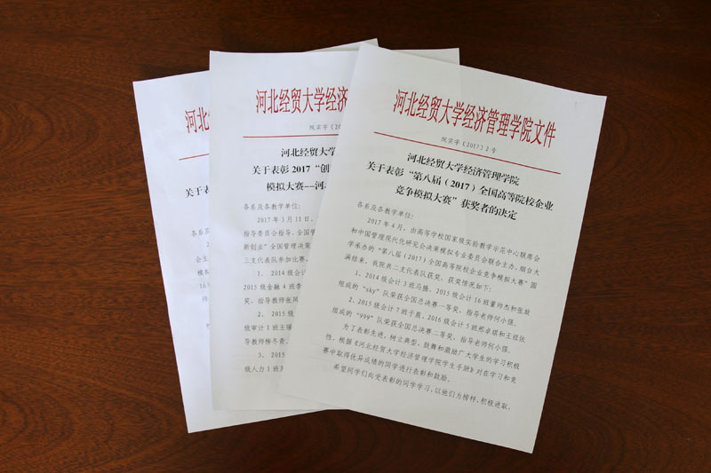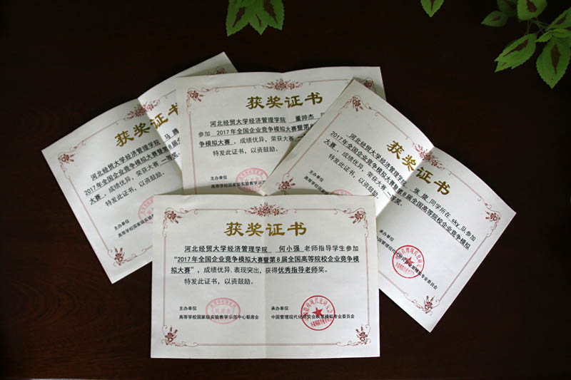 本次受表彰的团队均来自实践教学部ERP俱乐部,他们抓紧课余时间,认真设计,反复修改,最终凭借过硬的专业技术和优秀的协作能力取得了丰硕的成果。今年4月,在“第八届全国高等院校企业竞争模拟大赛”上,公司派出的两支代表队分别获得全国总决赛一等奖和二等奖;今年3月举办的“2017‘创新创业’全国管理决策模拟大赛——河北省赛”上,公司派出的三支代表队分别获得两个省赛一等奖,1个二等奖;在2016年12月“华北区第六届高等院校企业竞争模拟大赛”上,公司代表队获得大赛三等奖,公司在本次竞赛组织中表现突出,获优秀组织单位奖。