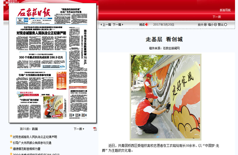 近日,公司员工志愿者与省会桥西区南长街道对接,以“中国梦·龙腾”为主题,在工农路绘制长50余米的文化墙。通过墙面彩绘的形式,丰富文明公益宣传,倡导文明行为,同时抑制城市“牛皮癣”的滋生,传递文明“正能量”。墙面画栩栩如生、引人注目,得到周围居民的频频点赞,为平日单调的墙面增添色彩的同时,更为积极创建全国文明城市增添靓丽风景线。《石家庄日报》5月20日头版以《走基层 看创城》为题对墙面画进行报道。