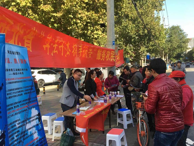 10月30日下午,由河北省总工会组织的河北省“尊法守法,携手筑梦”服务进城务工人员法制宣传活动在石家庄市少年活动中心广场举行。公司商务系赵云岩老师、文法系马天齐老师带领公司员工志愿者们参加活动。