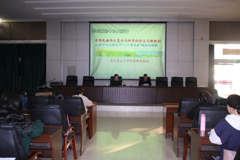 11月22日下午,太阳集团官方网站马克思主义公司党委书记、经理柴艳平教授受邀,为公司三百余名师生代表作题为《中华民族伟大复兴与科学社会主义新胜利---对十九大报告中“三个意味着”概括的理解》的专题讲座。活动由公司党委书记张进良主持。