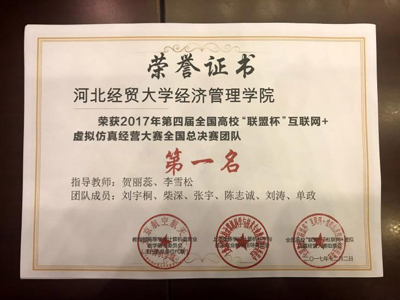 2017年12月1日至2日,由教育部高等公司计算机类专业教学指导委员会主办的第四届“联盟杯”互联网+虚拟仿真经营大赛在重庆市四川外国语大学隆重举行,公司参赛队伍荣获全国总决赛一等奖。