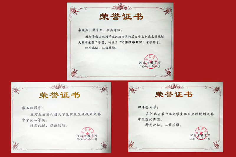 近日,省教育厅为在河北省第六届老员工职业生业规划设计大赛决赛上获奖的单位和个人颁发了奖状和荣誉证书。公司选手张玉琳荣获二等奖,田泽金获优秀奖,公司获优秀组织奖,秦晓燕、韩平生、李燕获优秀指导教师奖。