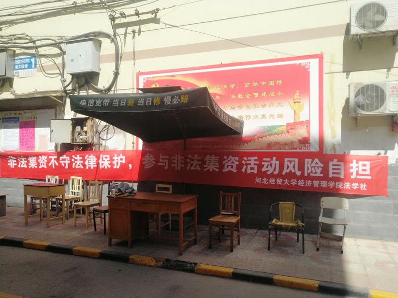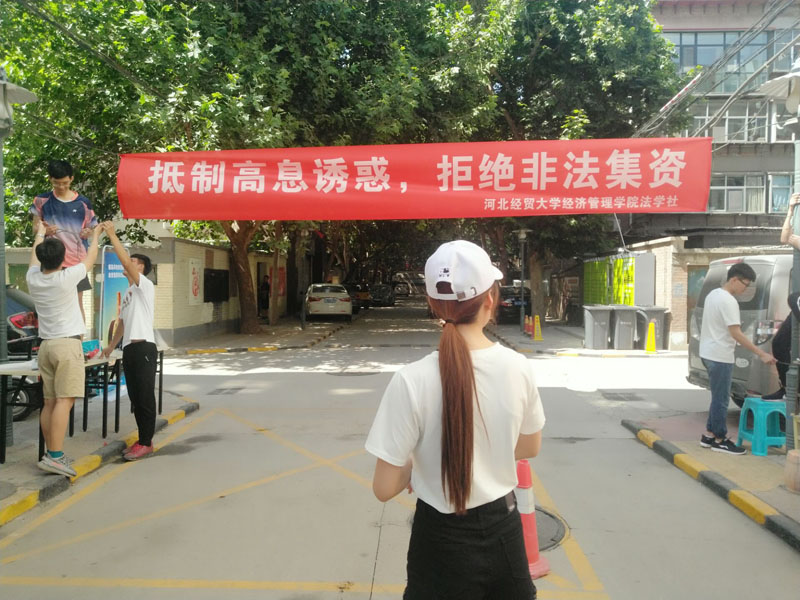 本次活动以“防范非法集资、构建和谐校园”为主题,重点结合防范非法集资的相关法律法规和政策、解答师生群众关切的问题开展集中宣传,活动采取发放宣传资料等方式进行。主场地设在校园甬道,法学社志愿者们过往师生发放宣传资料;志愿者们还走进公司家属区发放宣传单,向家属区的老人们宣讲政策法规,引来不少居民驻足聆听。