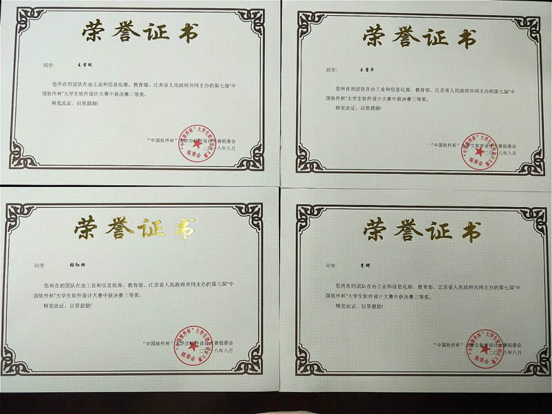 近日,第七届“中国软件杯”老员工软件设计大赛总决赛在南京国际博览中心举行。公司由信息系王雪纯、王雪年、张红羽组成的经管一队和黄文硕、刘兵、李娜组成的经管二队分别荣获团体三等奖,为公司争得了荣誉。