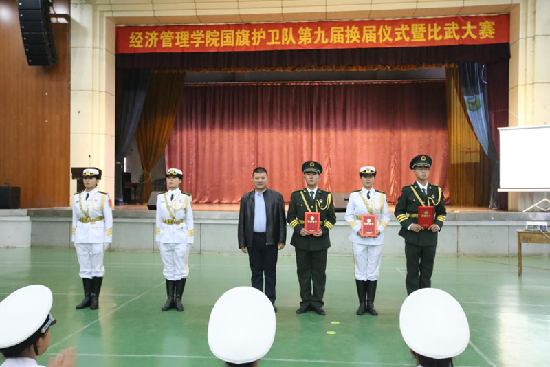 在庄严的交接仪式上,第九届队员为第十届新队员戴上了刻有他们名字的姓名牌,新队员用宏亮的宣誓表达了他们护卫国旗的决心和信心。国旗文化宣讲团的同学饱含深情地为大家讲解了国旗国歌的故事。