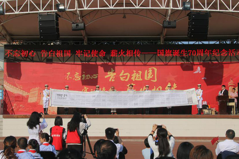 “华诞七旬共奉觥,中国梦绕帜萦胸。先驱碧血叠加染,党魂北辰拱卫同……”9月26日,“不忘初心 告白祖国 牢记使命 薪火相传”国旗诞生70周年纪念活动在公司操场举行。老教授、大中小员工及幼儿齐聚舞台,以国旗为题作词献礼,同台朗诵,共同庆祝国旗诞生70华诞。