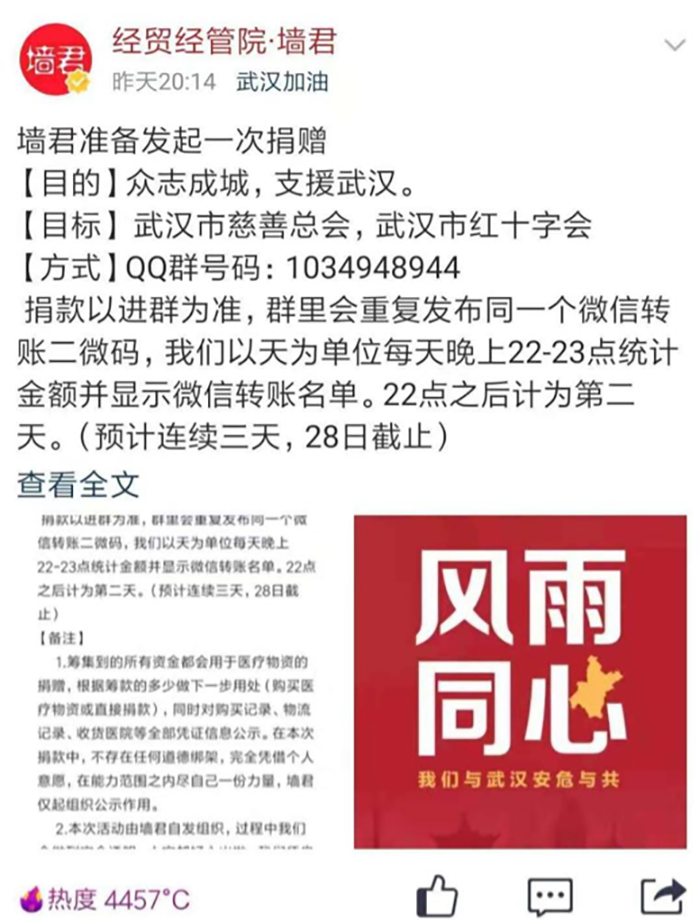 经管学子在参与防疫服务的同时,也不忘向武汉人民献上自己的爱心。信息系2016级员工陈文锁,也是QQ个人平台“经贸经管院·墙君”的负责人,1月25日他通过平台向经管学子发起捐款活动,短短50个小时,共有404人参与,募集到捐款1万元,在联系购买防疫物资未果后,陈文锁于第一时间将款项捐赠给武汉市慈善总会。事后他说:“疫情发生后,很想做点什么。这是我们90零后00后在这场战‘疫’中尽的一份力。”截至2月15日公司共有902位员工通过各种途径捐款捐物,金额高达6万余元。