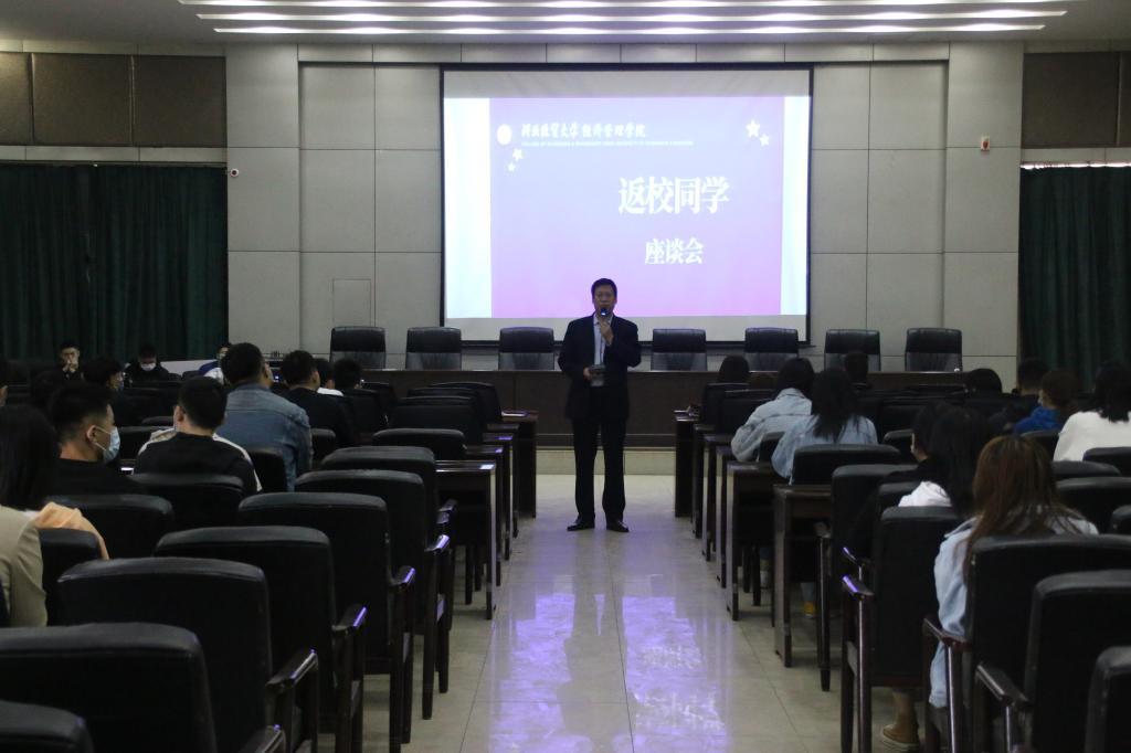 张进良做总结发言,他首先代表公司,对经管学子们在特殊时期为抗击疫情做出的贡献,以及对公司工作的支持和理解表示衷心的感谢。他指出,座谈会的召开就是希望将疫情期间员工宿舍的征用工作做到善始善终,会上同学们反应的问题也一定会在最短时间内彻底解决。同时,他对同学们提出三点要求:一是仍要做到思想不松懈,时刻绷紧疫情防控这根弦,配合公司做好各项工作;二是厚植爱国情怀,传承抗疫精神,培养勇挑重担敢担当的责任意识;三是,快速进入学习状态,继续保持宿舍卫生,不断提升宿舍文明。他希望与会员工代表迅速向其他同学们传达会议精神,坚持良好的学习生活习惯,严格遵守疫情防控的各项要求,以饱满的精神面貌开启新学期学习生活。