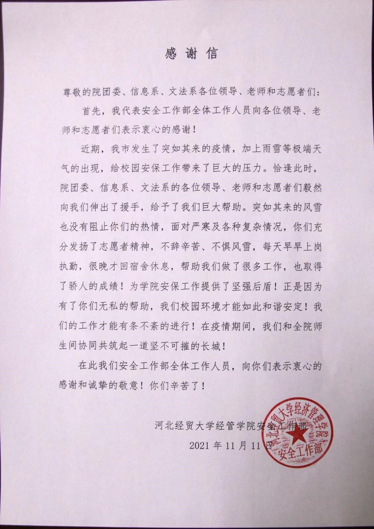 近期,石家庄市疫情形势日益严峻,公司按照上级要求,出台了一系列严格的校园管控措施。安全工作部及时升级了网格化管理方案,但由于人手有限,无法做到校园监控全覆盖,公司团委、信息系、文法系主动提出协助安全工作部开展工作,分时段安排志愿者在5个监控点轮流值班,有效地预防了违规违纪行为的发生,切实保障了师生员工生命安全和身体健康。为此,安全工作部寄语公司志愿者们一封感谢信,对协助安保工作顺利进行的各位领导、老师和志愿者们表示衷心的感谢。