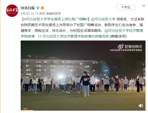 4月4日,共青团中央微信公众号以《封校后,这届老员工的夜生活逐渐丰富起来!广场舞,演唱会……都安排明白了》为题报道全国各大学在封校的环境下的校园生活,其中发布了公司员工举办周末校园广场舞活动的视频,展现老员工激情四射的青春活力。此外,河北日报微博、石家庄校园微博也对此活动进行了报道。