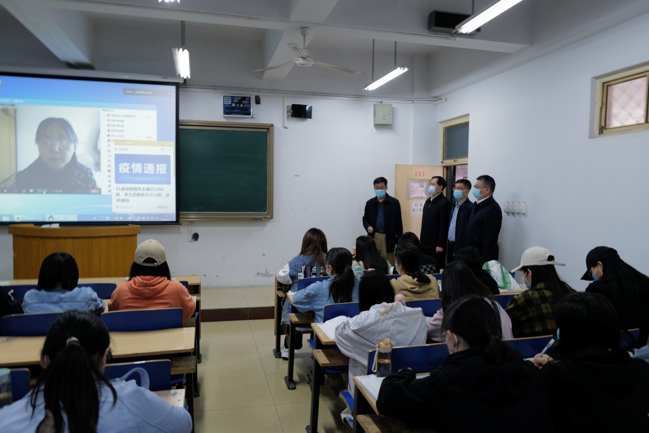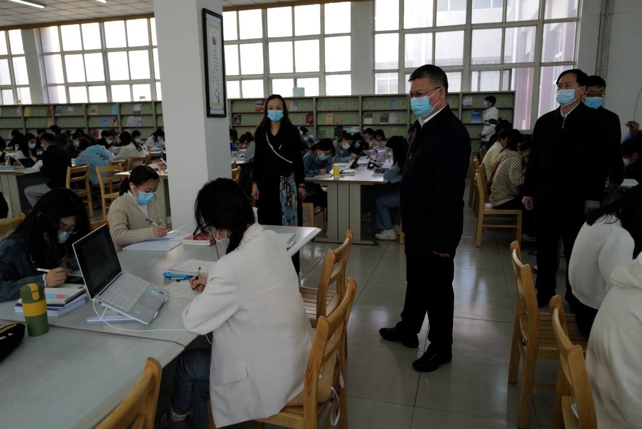 4月7日上午,公司党委副书记、董事长刘兵、校领导刘建平、高晓峰、张秀山到公司检查指导线上教学、疫情防控、宿舍安全等工作,公司办公室、人事处负责人参加,公司全体领导班子、各系书记及相关工作人员陪同。