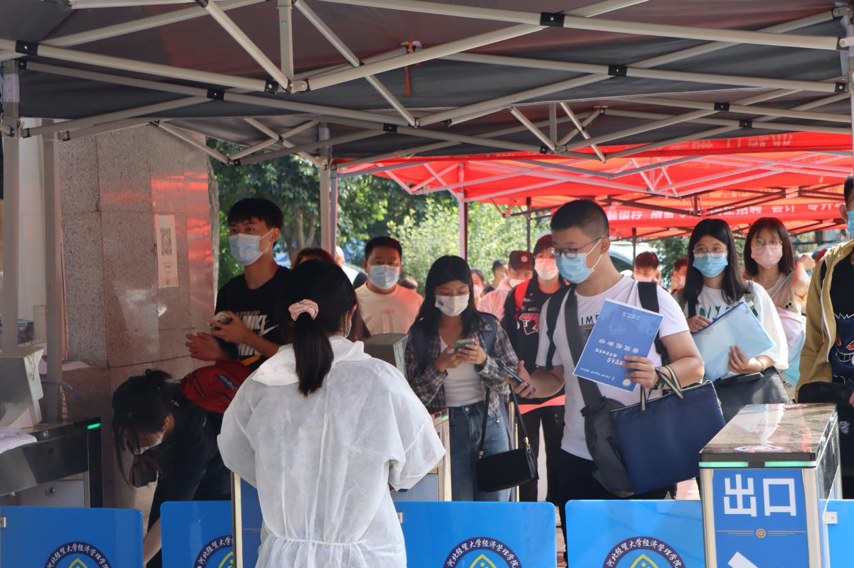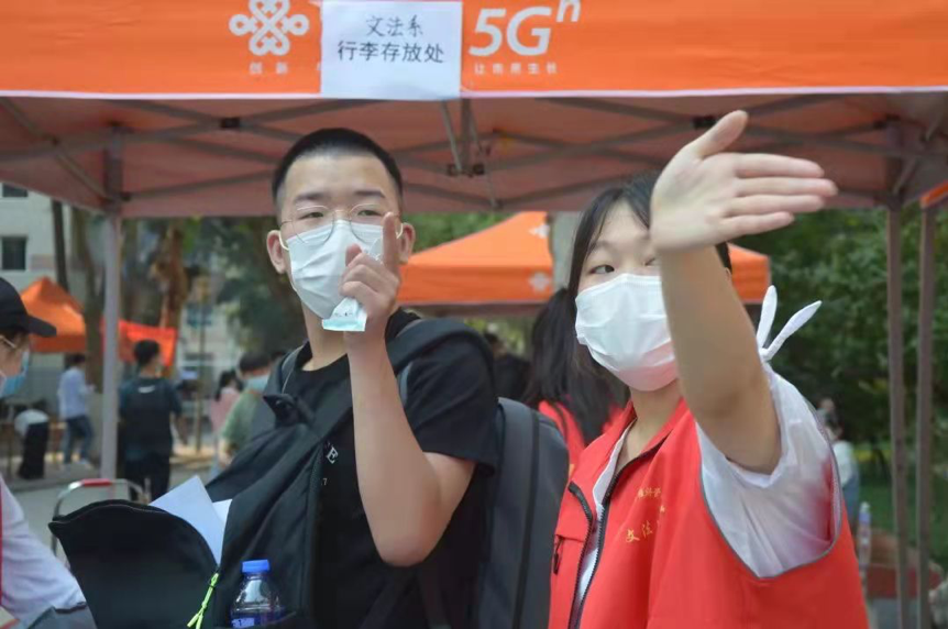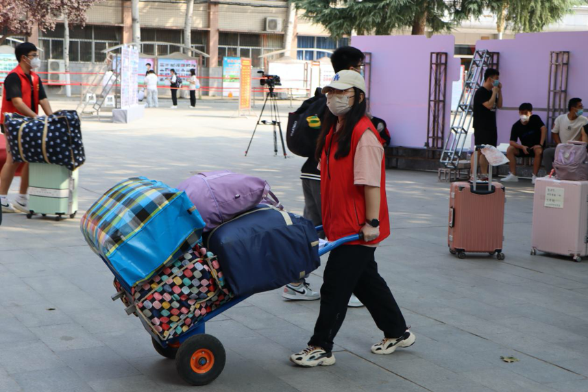 公司在火车站设立了接站点,志愿者身着防护服,迎接出站新生。报到现场开设新生入校通道和行李通道,新生们在入校通道经过测温、出示健康码和行程卡、人脸识别等流程后进入校园,经过抗原试剂检测、核酸检测后再由各系志愿者引导新生完成报到流程。他们的行李则由员工会志愿者全部酒精消毒后,通过行李通道放置于行李寄存处,待新生完成报到流程后,再由各系志愿者“一对一”搬运行李送达宿舍,搬运过程中志愿者们边走边介绍校园环境和生活经验,为新生们引路答疑。疫情防控,家长们虽然没能进入校门,但看到志愿者们热情暖心的服务,他们终于放下了那颗颗悬着的心。
