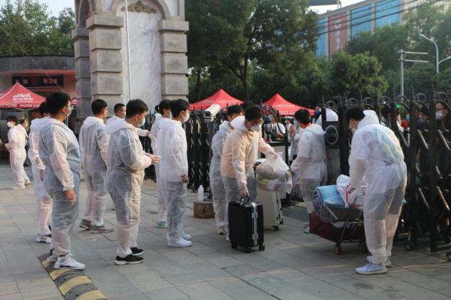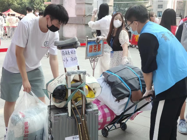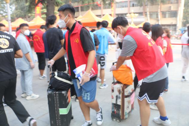 车站迎新工作的重点是把员工们安全送达,在校园迎新的志愿者们主要任务就是运送行李了。“要把接送行李秩序维持好,也是比较有挑战的事。”青协另一位负责人王子昆同学表示,“我们的人手不太够,有时候会出现新生来的集中,没有办法快速对行李进行消杀和转运。”新生报到那天中午一辆辆送子求学的私家车停在东门,大件小件的行李搬运下车,志愿者们既要完成对每件行李的消杀,还要记清楚哪件行李是哪个系的员工的,将其转运至校园内后,联系各系志愿者来准确接收,面对这么杂乱的现象,“我们的志愿者解决的办法只有一个,就是每个人付出200%的努力去完成。”新生报到那天天气比较热,志愿者们身上的防护服也不透气,来回拿行李,累得大汗淋漓,里面的衣服一把都能拧出水来。“但大家热情高涨,临危不乱,不辞辛苦,各司其职,圆满地完成最繁重的工作。他们是勇挑重担的‘摆渡人’。”院员工会主席史兴业这样评价自己的团队成员。