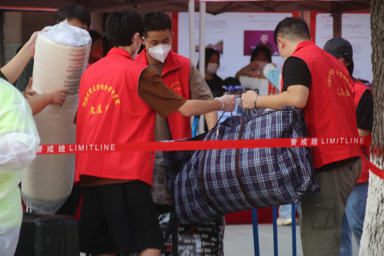接力院员工会志愿者完成行李运送任务的是各系志愿者。依然是早上6点半,各就各位,他们分工明确,一小部分人引导员工做抗原、核酸、完成报到手续;一大部分人手拿肩扛,大包小包,不厌其烦地来往于各系站点和宿舍之间。