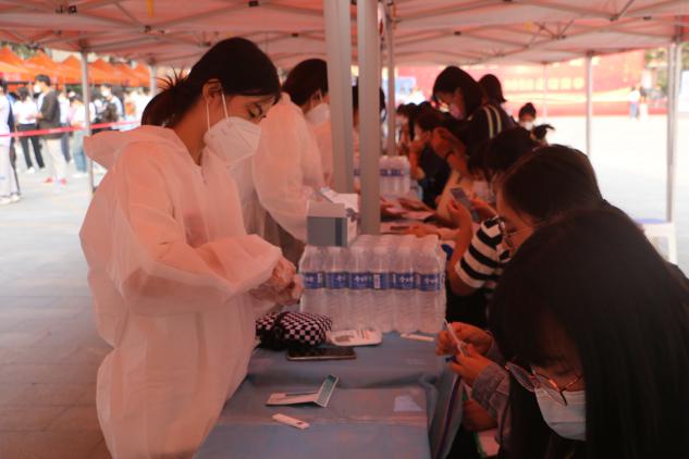 从开学到现在,核酸检测几乎每隔一天做一次,日常校园守护更是天天值守。每日早上天刚蒙蒙亮,志愿者们就早早来到操场上,身着防护服,佩戴口罩,坚守在分配好的核酸检测通道旁,进行扫码工作。这项工作看着简单,可一站就是三四个小时,还要维持员工队伍秩序,督促同学们保持一米间隔距离,助力医生做好核酸检测工作。