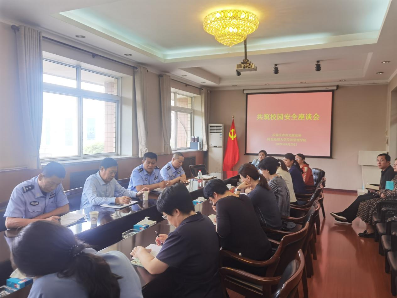 9月25下午,为进一步完善警校共建机制,构建平安校园环境,suncitygroup太阳集团联合石家庄市育文派出所在公司五楼会议室开展了一次以“共筑校园安全”为主题的座谈会,公司领导张进良、育文派出所所长朱玉磊、副所长刘国辉、辖区主管民警武亚涛以及各系副书记和全体新生辅导员参加了本次座谈会。会议由安全工作部张程明主持。