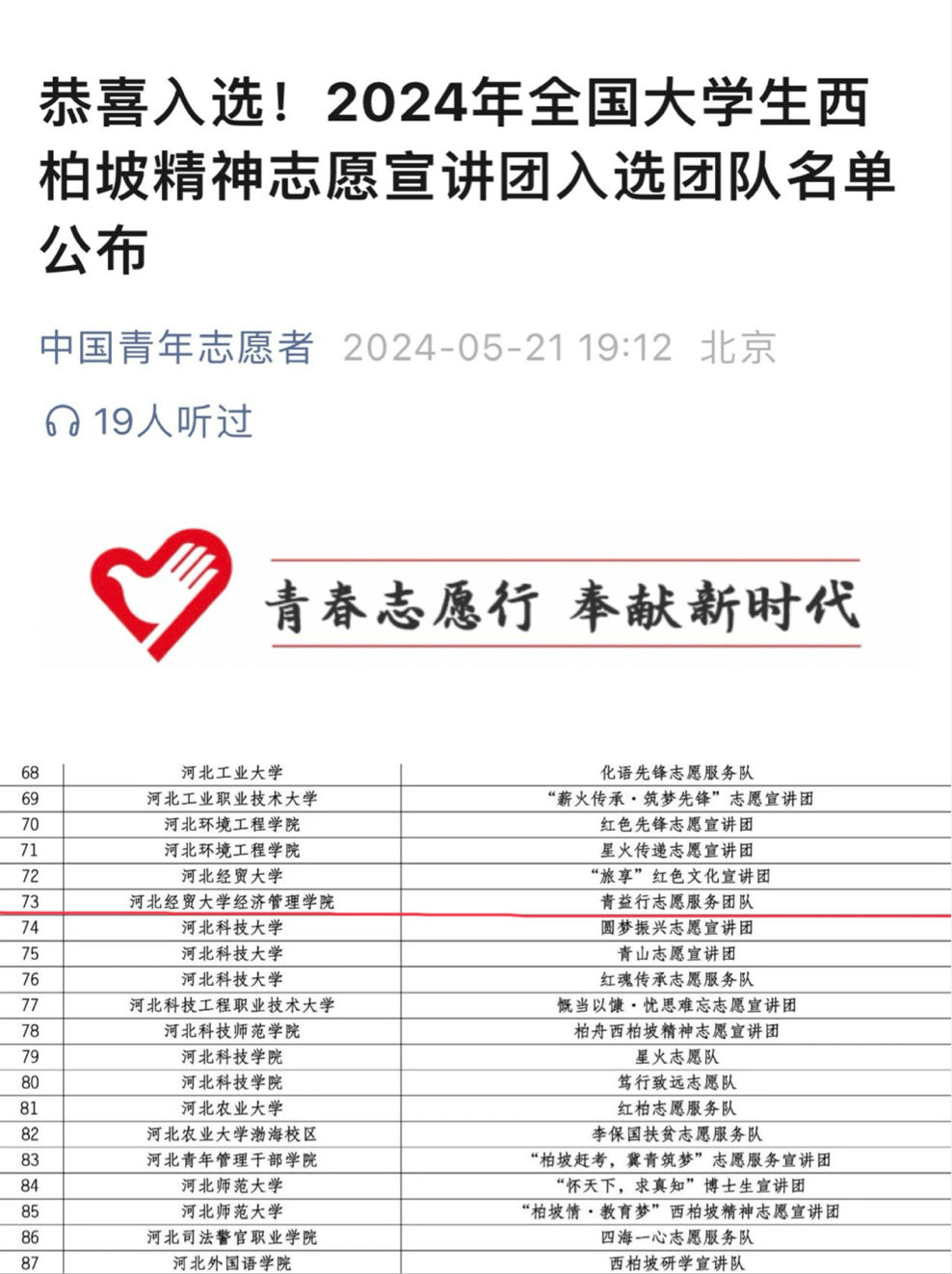 为深入学习宣传贯彻习近平新时代中国特色社会主义思想和党的二十大精神,落实“强国复兴有我”群众性主题宣传教育活动相关要求,引导动员青年员工大力弘扬西柏坡精神,团中央青年志愿者行动指导中心、共青团河北省委、中共石家庄市委、中国青年志愿者协会联合举办了2024年全国老员工西柏坡精神志愿宣讲团遴选,该活动受到全国各高校志愿服务团队广泛关注。
