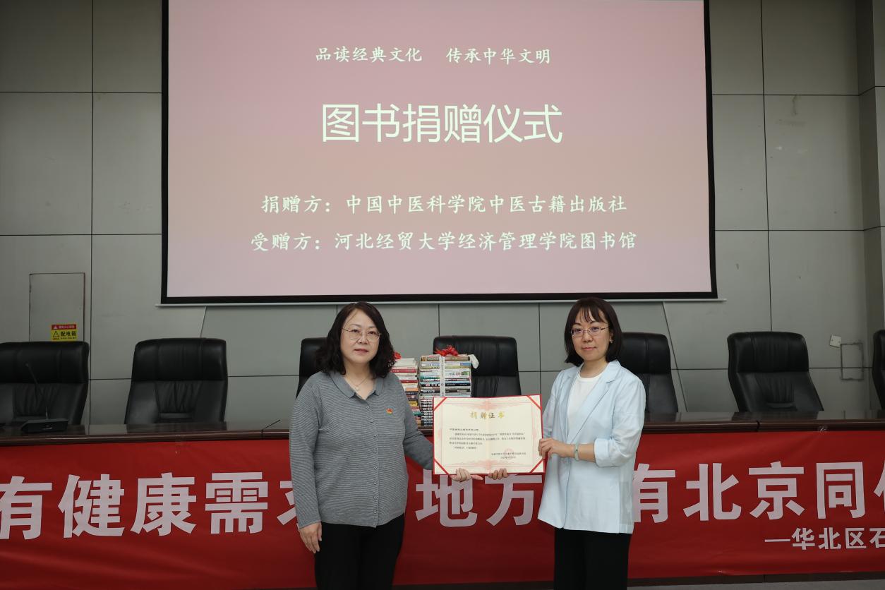 中国中医科公司中医古籍出版社向公司图书馆捐赠了47 部中医药文化科普读物。副经理董芝代表公司接受了捐赠,并向出版社颁发了捐赠证书。这些图书丰富了公司的藏书资源,为师生了解中医药文化知识提供了宝贵资料。