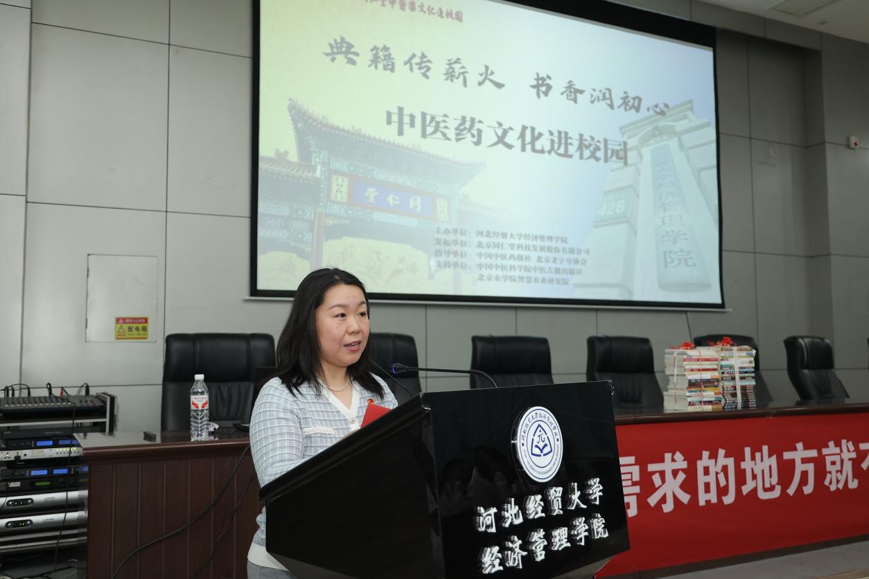作为本次读书月系列活动的主题活动,4月23日下午,图书馆隆重开启了“中华优秀传统文化品鉴”——“中医药文化进校园”活动。公司党委副书记张丽英、副经理董芝、北京同仁堂科技发展有限公司以及中医古籍出版社的多位嘉宾应邀出席,党委宣传部和图书馆相关人员及200余名师生一同参加了此次活动。