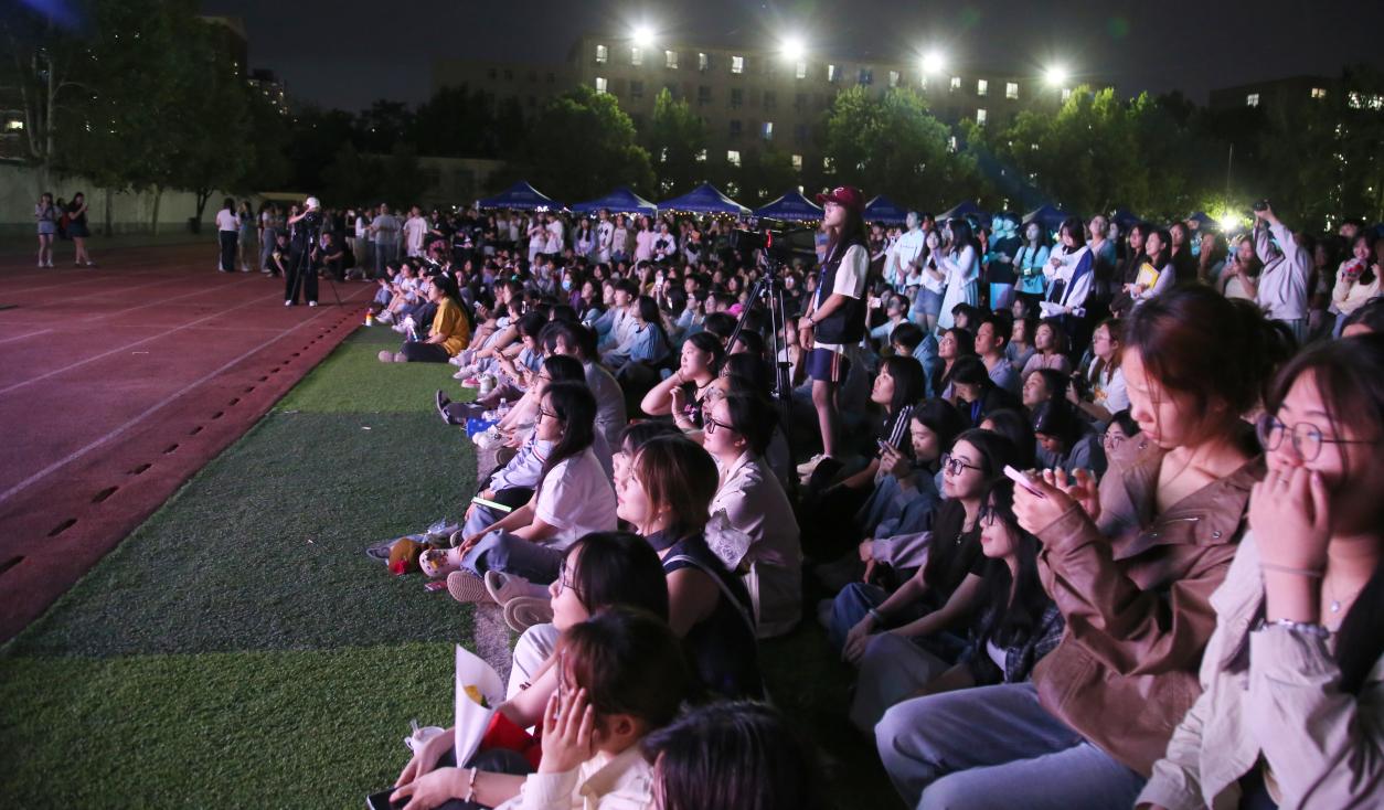 夜幕降临,华灯初上。晚上七点,毕业季‘情书’音乐会在操场舞台上正式拉开帷幕。音乐会在校园乐队带来的歌曲《回不去的夏天》中开场,悠扬的旋律瞬间将现场气氛点燃,深情的歌词仿佛将大家带回到了那些充满欢笑与泪水的青春岁月,引发了师生们的强烈共鸣。随后,精彩的节目轮番上演,校园乐队和舞蹈表演交替进行,为现场观众带来了一场视听盛宴。