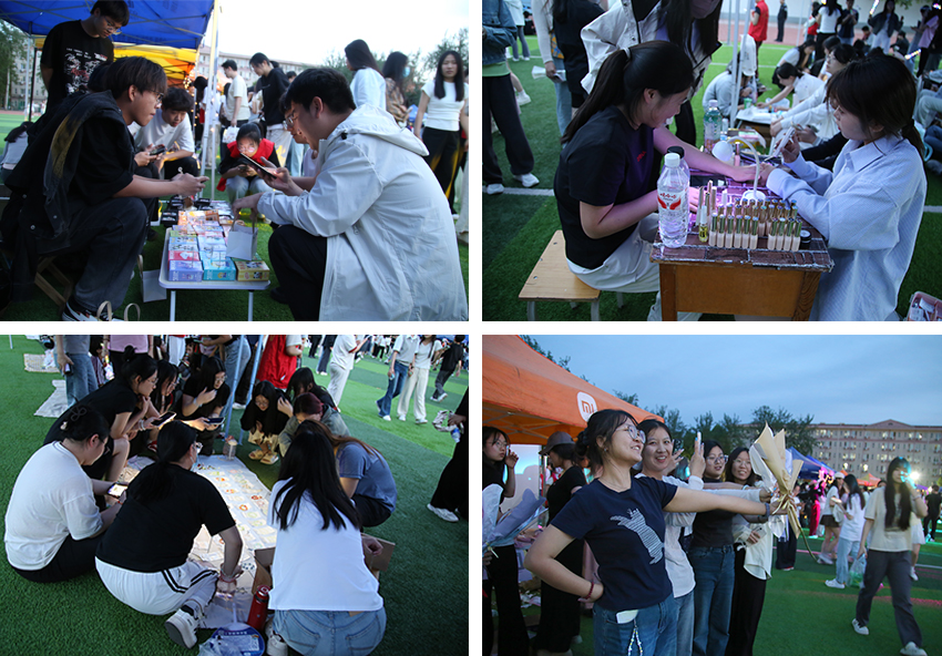 文化创意区内,同学们发挥奇思妙想,将兴趣爱好与艺术创作相结合,展示了充满创意的手工艺品和绘画作品,吸引了众多师生驻足欣赏和选购;时尚服饰区则汇聚了各种风格的服饰,还有美甲、手串等满足师生DIY的个性化时尚需求;游戏互动区欢声笑语不断,各种趣味游戏和挑战项目让师生们在轻松愉快的氛围中增进交流,释放压力;生活用品区则提供了各种实用且富有创意的生活用品,为师生们的日常生活带来了便利和惊喜。