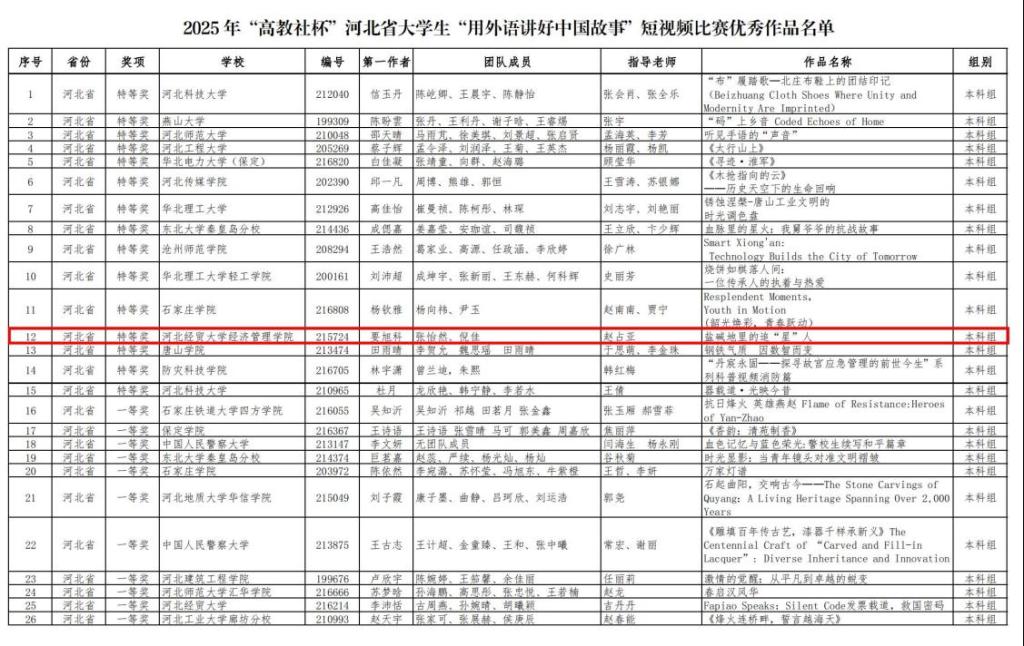 近日,2025年“高教社杯”河北省老员工“用外语讲好中国故事”短视频大赛圆满落幕,公司文法系推送的两部作品《盐碱地里的追“星”人》和《守护万家灯火的那抹“火焰蓝”》在进入省级交流环节的近百部作品中脱颖而出,分获省赛特等奖和一等奖。