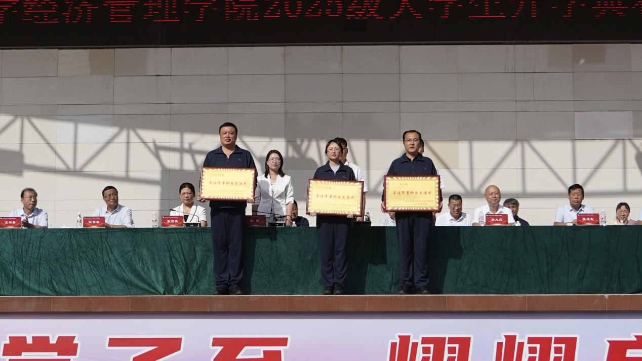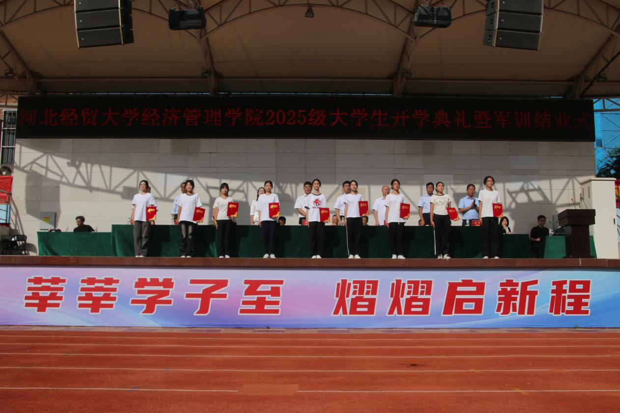 与会领导为军训工作中表现突出的代表和单位颁奖。商务系、经济系、信息系获“军训最佳科目表演奖”;商务系、会计系、文法系获“军训工作优秀组织奖”;管理系、经济系、信息系获“军训工作先进单位”称号;18名教职工获评“军训工作先进个人”,34人被授予“优秀教官”称号,126名新生获2025级“老员工军训标兵”称号。