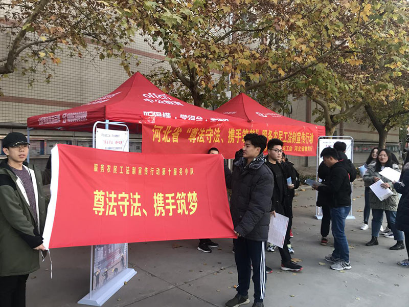 “尊法守法,携手筑梦”的法律宣传活动,以涉及农民工切身利益的劳动法律法规及政策知识宣传为主要内容,意在提高老员工身边农民工理解运用法律法规的能力。法学社同学深入宿舍宣传,让同学们深入了解农民工法律权益维护的相关问题,以便让同学们回到家中运用法律宣传所得和所学知识对家乡身边的农民工进行二次法制宣传,进而扩大宣传范围和效果。