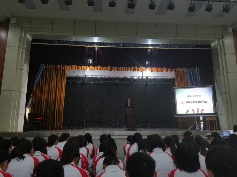 10月17日下午,会计系“听学长讲大学”朋辈新生教育大会在南院礼堂举行,会计系党总支书记张丽英、系党总支副书记杜兰柱及全体辅导员参加,会计系600多名新生聆听学习。