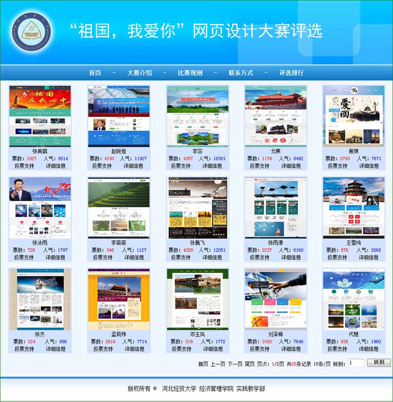 “祖国,我爱你”网页设计大赛由实践教学部主办,旨在进一步推进校园网络文化建设,提高公司员工的科技创新能力,增强员工的爱国意识。大赛覆盖面广、技术含量高、实用性强等特性深受员工们的欢迎,共有289人报名参赛。按照大赛流程先举行了网页设计入门测试,测试通过的100名员工参加为期一个月的赛前培训,课程包括 Photoshop 图像处理和 Dreamweaver 网页设计基础学习,培训全程由杨会丽老师指导,员工在机房上机动手操作。培训结束后,员工运用所学知识,把自己对“祖国,我爱你”的理解设计成创意网页作品参赛。经初赛和网上公开竞票环节,评选出25个优秀网页作品。通过上万的网上总投票数可以看出,员工们对“祖国,我爱你”的网络演绎,在全院师生中获得了广泛的关注度,充分发挥了网络传播的“正能量”。