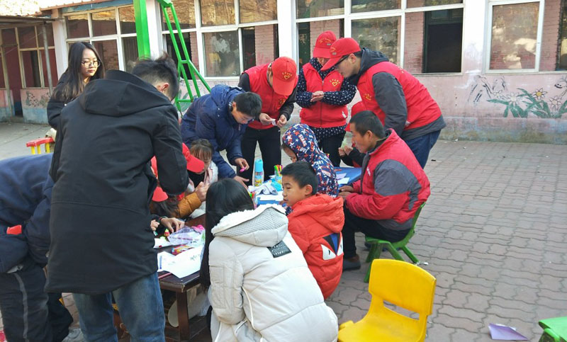 在公司,志愿者分成三组,陪孩子们叠纸鹤、扔飞机、画画、写字、捏橡皮泥等。志愿者还带领孩子们玩跳格子和老鹰捉小鸡等游戏,校园里不时传来欢声笑语,志愿者与孩子们度过了快乐的一天,并为他们带去了温暖与关怀。