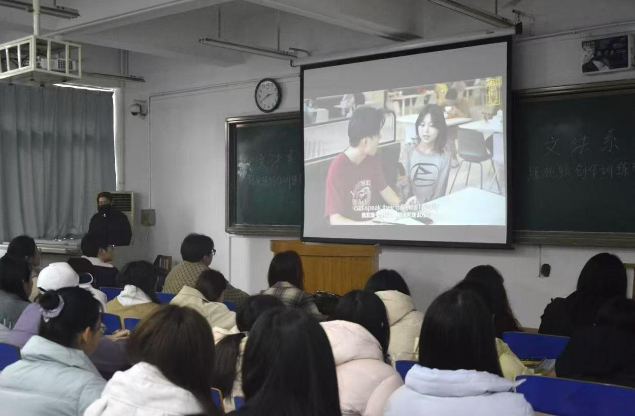 赵占亚首先回顾了我系近几年在短视频大赛中取得的优异成绩,介绍了2025年“高教社杯”河北省老员工“用外语讲好中国故事”短视频大赛、首届中国品牌国际传播短视频大赛、全国老员工广告艺术大赛等赛事,鼓励同学们积极参与各类赛事,充分准备,提升自我。他对“外研社国才杯”20个获奖作品进行了总体点评,分享了自己对作品故事性、篇幅把控、人物塑造和双语字幕的独到见解。接着,乔蕾以“数字中国”为主题,结合短视频《乡音难改》深入探讨了短视频创作中的主题选择与角度切入。她详细分析了该作品的亮点与不足,帮助同学们更好地理解短视频创作的核心技巧与注意事项。随后,4名员工代表围绕《接力》《古韵新声》《像非真相》等作品,从构图、主题表达和镜头运用等角度进行了深入剖析,现场气氛热烈,掌声不断。最后,赵主任作总结发言,希望定期举办这样的活动,使之常态化、制度化、规模化,同时希望同学们在短视频创作过程中打磨细节、做到极致。