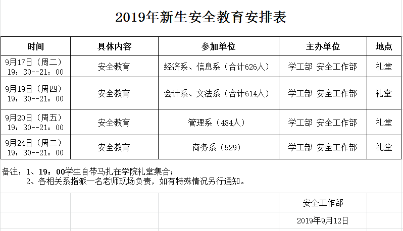 2019年新生安全教育安排表