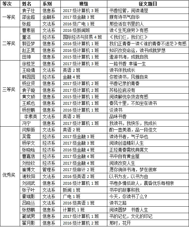 由图书馆举办的 “知识成就梦想,阅读美丽人生”征文活动圆满结束,活动期间各系、班同学积极响应,踊跃参与。同学们谈读书的所感所悟,主题鲜明,情感真挚,最终,经过评委们的精心评审,共评出33名获奖同学,其中一等奖3人,二等奖5人,三等奖10人,优秀奖15人。