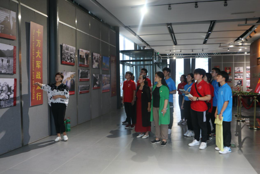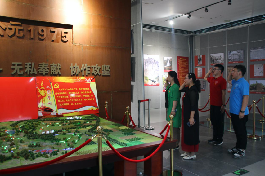 实践小分队刚刚下大巴,便看见一条宽广的水渠由山上奔涌而下,“千峰百嶂跨险要,一跃冲向万里涛”,正是跃峰渠的真实写照。而跃峰渠纪念馆正跨立于跃峰渠水流之上,渠水流淌而过,仿佛在不断冲刷着历史的尘埃,谱写着太行儿女荡涤人心的奋斗之歌。进入纪念馆,“战天斗地、艰苦奋斗、无私奉献、协作攻坚”的跃峰渠精神印刻在似悬崖峭壁般的深棕色墙壁上,公司党委副书记张丽英带领小分队师生党员,伫立于党旗前,重温入党誓词。
