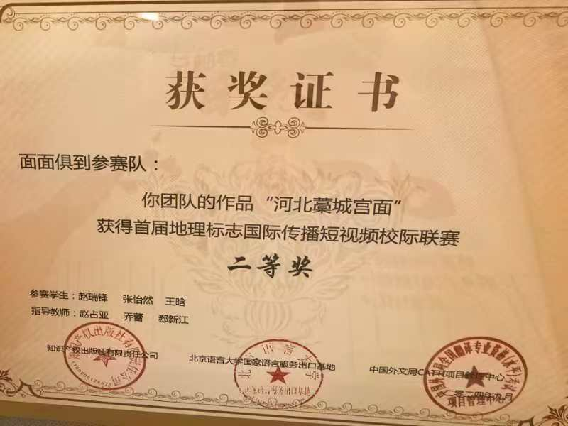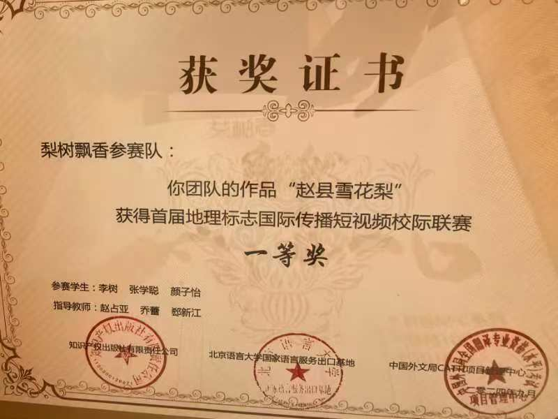 大赛历时三个月,文法系赵占亚主任和乔蕾老师带领制作团队在公司领导的大力支持和全院师生的积极配合下,赴河北赵县古梨园、藁城宫面厂和福建武夷星茶叶公司现场拍摄,创新角度,不辞辛苦;在后期剪辑制作过程中反复打磨,精益求精;在抖音平台投票环节上下联动,竭尽全力。最终,功夫不负有心人,公司推送的3部短视频作品《赵县雪花梨》、《武夷山岩茶》和《面面俱到---藁城宫面》在386部作品中脱颖而出,分获国赛一等奖和二等奖。