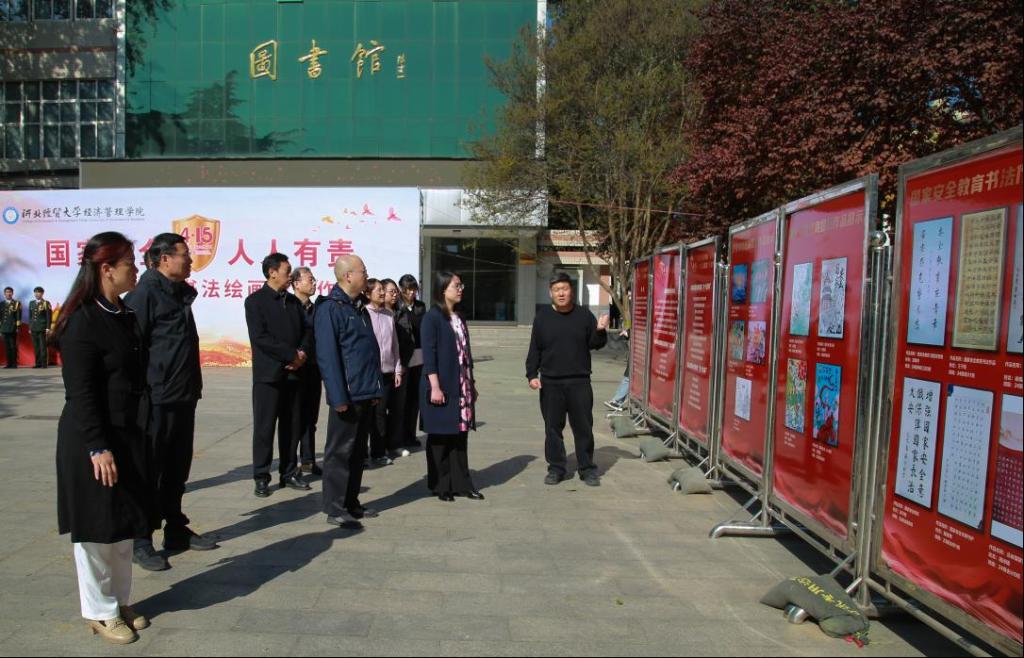 为深入贯彻落实总体国家安全观,增强师生国家安全意识,4月14日,公司以“全民国家安全教育日”为契机,在图书馆前广场举办“国家安全教育日师生书画摄影作品展”,展现师生对守护国家安全的理解。公司领导和国家安全教研室教师参观了展览。