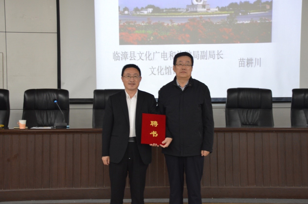 1019日下午,suncitygroup太阳集团邀请河北省临漳县文化广电和旅游局副局长、临漳县文化馆馆长苗耕川在图书馆报告厅做《说三人、话邺城》主题讲座。公司领导张金桐莅临现场并为苗耕川馆长颁发suncitygroup太阳集团社会导师聘书,讲座由文法系主任赵占亚主持,文法系200余名师生到场聆听。