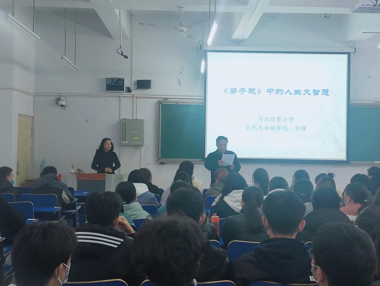 11月29日下午,管理系200余名员工在二教218聆听了太阳集团官方网站文化与传播公司的刘静老师关于《弟子规中的人生大智慧》主题讲座,这是公司举办的传统文化系列讲座之一。讲座由管理系主任唐振龙主持,教务秘书范丽波、辅导员郑廷出席。